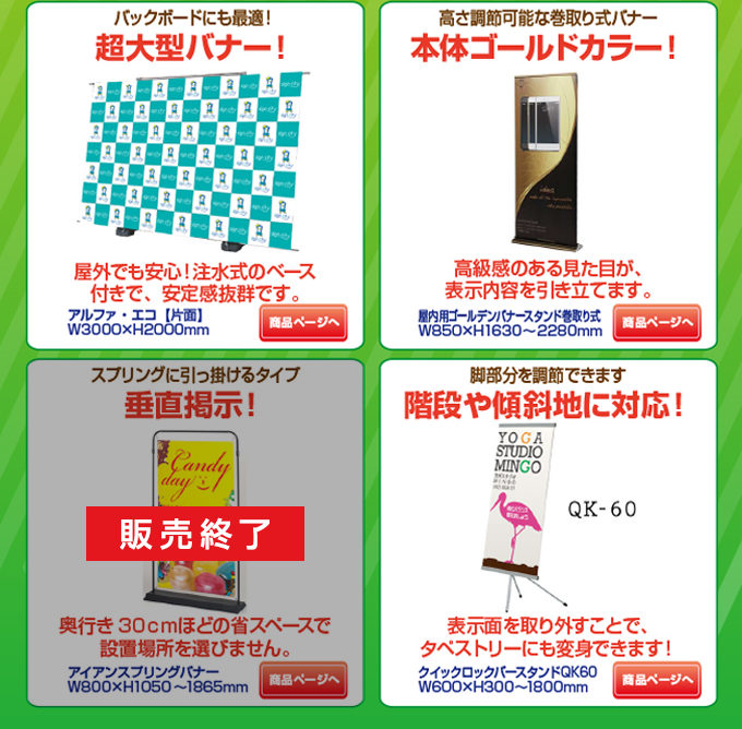 全面的に掲示内容を訴求することが出来るため、アイキャッチ効果も抜群なバナースタンドで是非イベントや展示会、店頭の販促ツールとしてバナースタンドをご活用下さい。